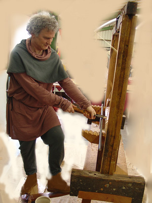 This outfit was made for a friend who runs our woodworker’s guild for his birthday. He reproduced a foot-treadle lathe from the period print below and wanted an outfit to match the look of the print. I used linen that he provided that was originally shocking pink and turquoise but was tamed with some brown dye into the lovely mauve and slate blue that you see to be more indicative of natural dyes. I was going just on the print so I interpreted this along with workingman’s clothes of the 15th century and made hosen, a tunic, and a hood.